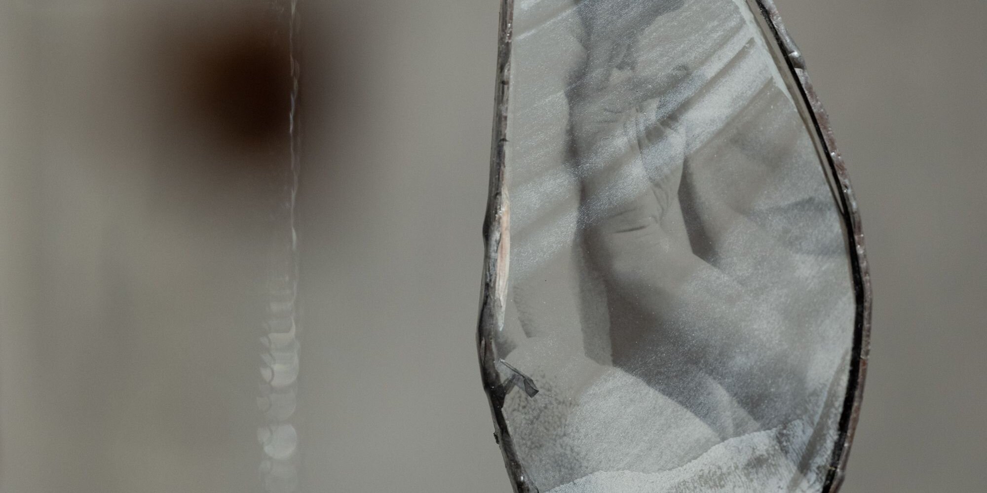 我在这呢喃中转了两圈,从圆缺处往窗边挪。房间一角有数条细链自天花板垂下,链子上坠着珍珠、玻璃残片、树脂等,在窗口漏进的阳光和室内的射灯交投下熠熠生辉,让人不由得伫立凝望:树脂里藏着鲜艳的血块;玻璃片上转印着黑白照片的图像——翻转的手、瞥视的眼、两人相伴的背影;金属框嵌着一块藏有裂痕的玻璃,我想蹲下细看时又被系在末端的一缕发丝吸引了目光……。(《你眼中闪烁的光芒》[glimmer in your eye],2023)