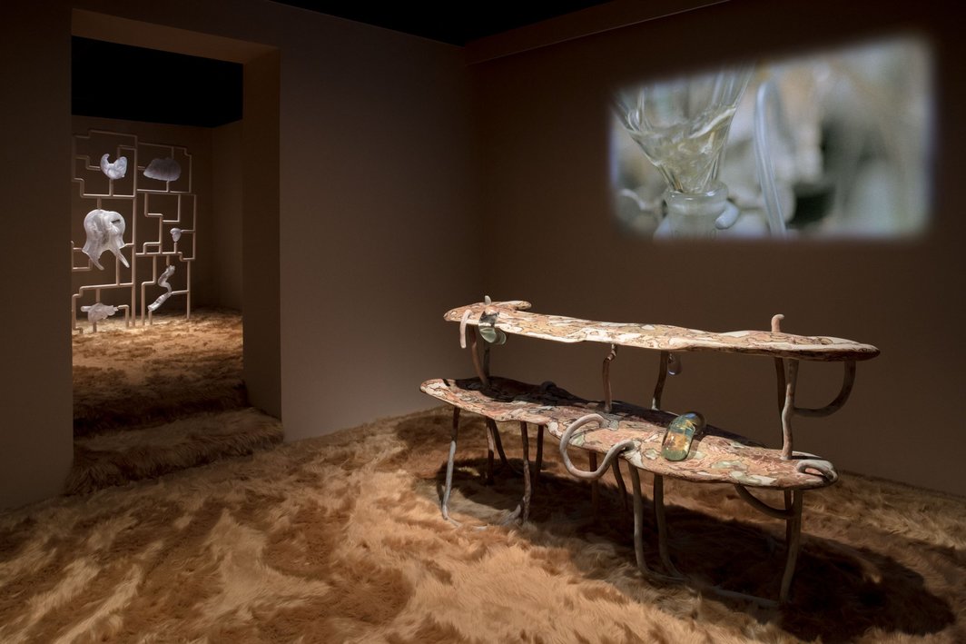 入口处飘荡着的纱帘、烟雾、香气及步入后温度的改变提示着空间的转换,都市的嘈杂和日光被隔在了玻璃门外。穿过浅橘色的瓷砖走廊,按照房间入口的文字提示,我从桌上拿起一根线香,点燃,持着它绕橘色纱帘围成的圆走动。烟雾幼细升起,眼睛留意着不能燃着帘幕,脚步亦变得谨慎而踏实,仿佛在参与仪式。帘幕后传来细语:“you trickling, sinking, kissing, rocking cradles, wet blankets, I hum a lullaby lulling you to deep sleep……”(你,涓涓流淌,下沉,亲吻,晃动的摇篮,濡湿的毛毯,我唱起摇篮曲,送你沉入睡眠……)