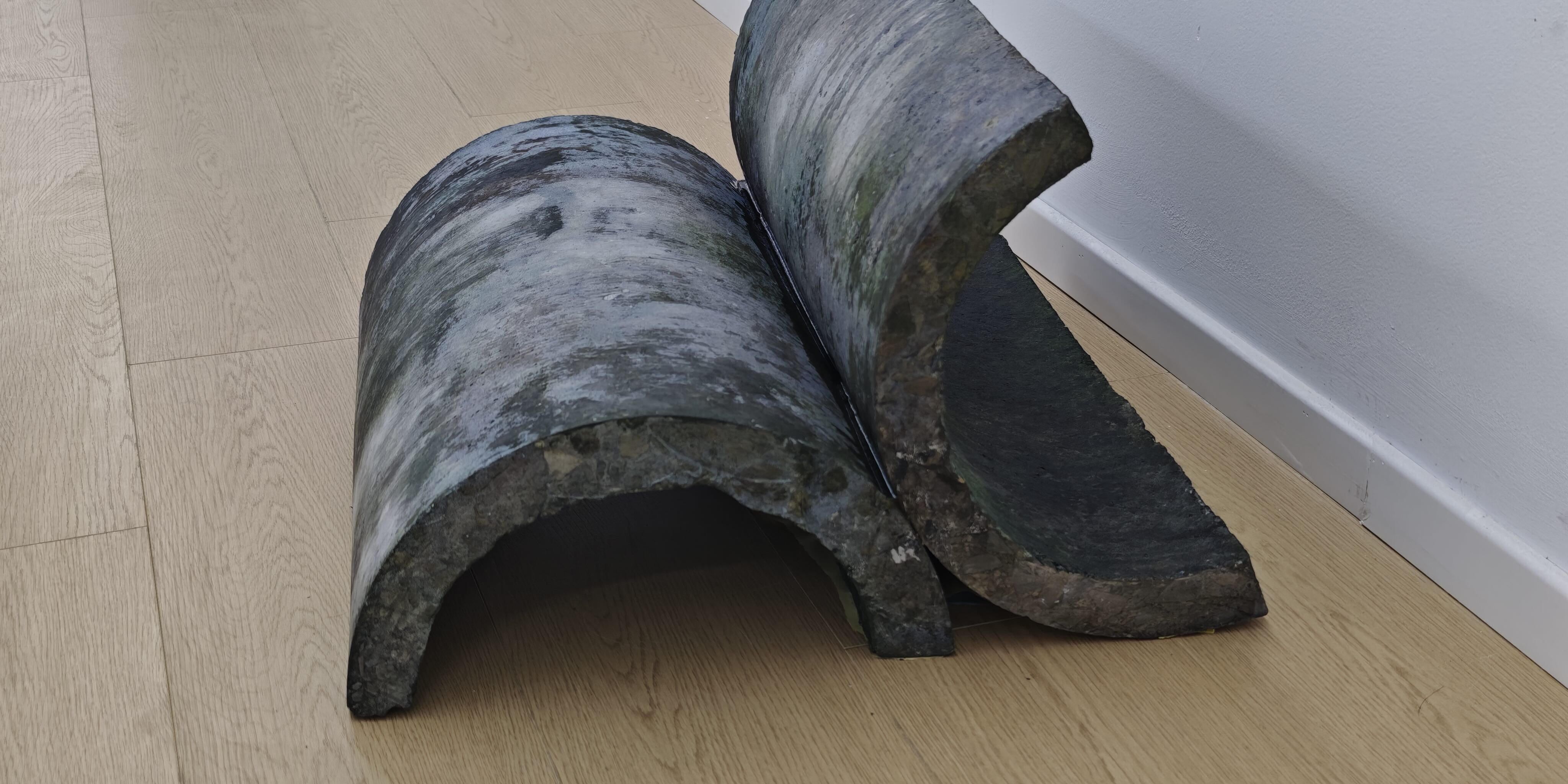 同名作品《奇迹》(本文提到的作品均创作于2025年)中的水泥管,如城市的肠道般被翻转至展厅地面。在作品《是永远不是》与《世界三》中,那些散落在地的“布料”实则是坚硬的铜或铝,它们或覆盖着拟态的金属躯块或被其压制。这种将柔软织物定格为坚硬金属的质地转化,在山西奥瑞非法收购遗体事件的背景映照下,显露出极为冷酷的现实指涉:工业材料的伪装仿佛包裹肉身的尸布。何岸善于制造冰冷物质的温度感。作品《九霄》视觉上是几块废弃的瓦楞纸箱,纸皮表面带有铅笔擦拭出的陈旧包浆。铅笔的石墨粉在其创作语境中,类似一种附着情感痕迹的生命粉尘,腐蚀着廉价与被弃置的现成物,使它们尽管年日如草,却仍因生命的发旺而确证着某种存在。