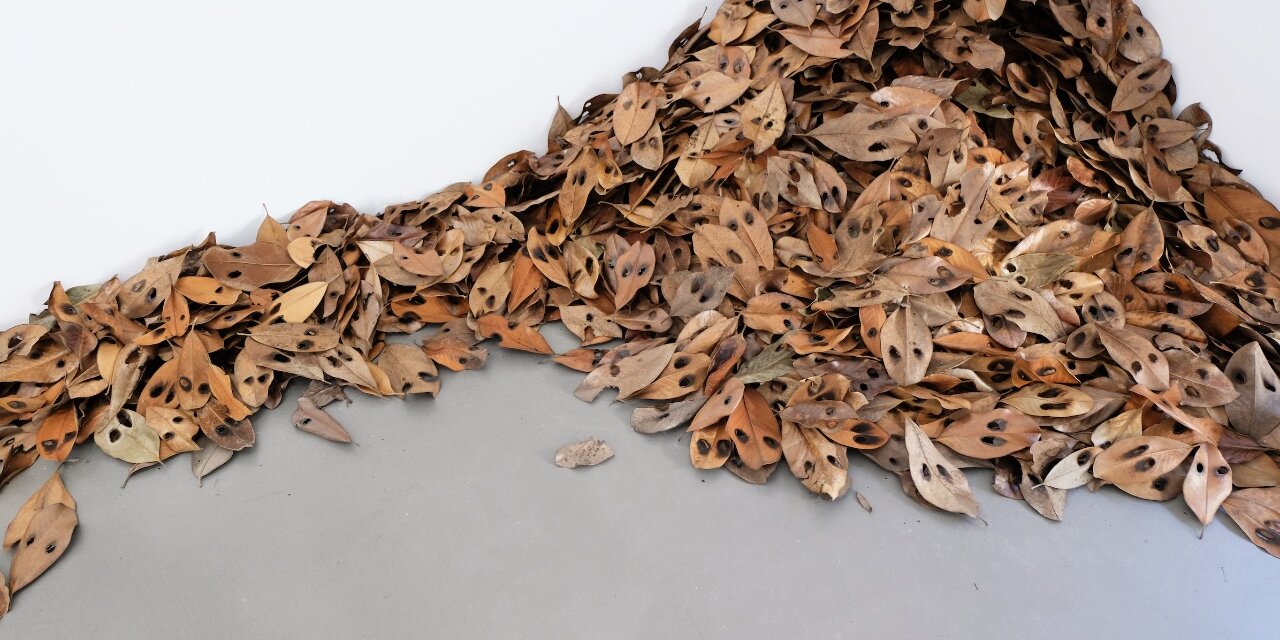 金亚楠的展览从堆积在墙角的广玉兰枯叶开始。近万片树叶每片都被他用打火机灼烧了两个孔洞,宛如无数双荒诞又可怖的眼睛;它们沿着墙根铺陈开来,为方正的白色展厅勾勒出一道不规则的边界。此时的南京正值落叶乔木新陈代谢的迷人时节,逸空间所在的文创园和街边,同样遍布黄褐色的凋零痕迹。