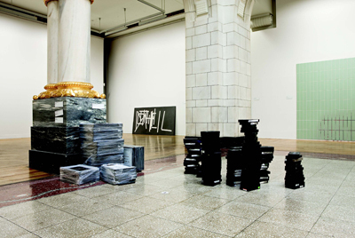 对我来说,“吓成抽象”就像一场没有出口的荒诞主义戏剧:这场大制作的全部意义就在于止步,在于变得几乎毫无生产性。这是我第一次在美术馆举办个展,所以当然要考虑如何构思这场展览。我不想把它做成回顾展,但也不想全都用新作品。我的计划是让过去四年创作中的亮点成为新作展示的语境。最后想到的办法和我创作的整体逻辑保持一致,即严肃对待美术馆的慷慨邀请,同时打断这一邀请散发出来的积极气氛,具体做法就是把材料和作品一股脑倒在美术馆里,不管它们被放到什么地方或者看起来如何。运输工人把作品放在哪儿就是哪儿,仿佛展览的前提就是把所有东西——收藏的或借来的作品,以及从我工作室运来的作品——扔进美术馆,把它们弄到门里面就行了。这一点完成以后,我在美术馆空间内做的所有事情都有些随机意味了。这种策略与我“心不在焉”的整体创作思路相一致。我想让“心不在焉”成为我创作的核心,仿佛一切都没什么大不了。对我来说,有一点也特别清楚,那就是只有美术馆——就算我可能不愿意把所有时间都花在这上面——才会允许你这么干。我想象不出还有其他什么地方会接受并欣赏这种做法。所以我的作品把所有伴随这类策略之机构化的矛盾和讽刺都掉转过来了。
