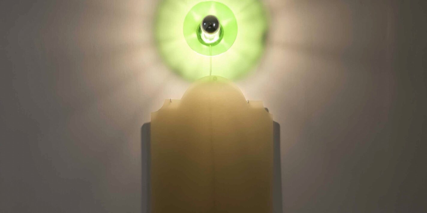 石膏树脂复合材料制成的“星星”散放于地面各处,有的半埋在闪闪发光的“黑金沙”堆里。分节的机械肢顶端装着六角形铜片,从画廊薄荷绿的墙面上伸展出来。陈沁昕制作的这些小物件带有一种复古未来主义的媚俗感,如同《迷离时空》(Twilight Zone)里的形象,完全不在意科学上的真实性。展厅另一处,两盏灯安装在相对的两面墙上,分别散发出橙色和绿色的光晕。这组题为《光子I》《光子II》(均创作于2022年)的作品把银河辐射(galactic radiation)会导致认知损伤的威胁转化成了怪诞的室内装饰品。
