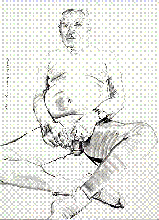 巴查迪对相处三十多年的伙伴克里斯托弗•伊什伍德(Christopher Isherwood)的全身像,看上去令人难过,作品创作于这位知名作家1986年因癌症去世前不久。巴查迪的这张作品,在描绘生命的同时,对即将到来的死亡,进行思索,他对病中的伊什伍德进行了详细的描绘,