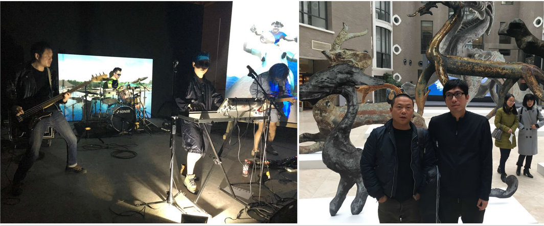 至于这内部逻辑除了参展艺术家共享的“某种‘极端’的,甚至‘嚣张’的状态”(策展人语)以外,还有其他什么内容,恐怕很难总结。参展艺术家龚剑的解释是:“乌尔善的电影《画皮》,皮肤有了,再把摇滚乐队请进美术馆表演,给大家解放一下。”摇滚乐解放当代艺术圈显然还任重道远。开幕后去吃饭的路上,AV大久保主唱走在我后面跟朋友聊天:“后天还要去三亚,三亚艺术季的afterparty。”“当代艺术走起来!”朋友欢呼。(就在我写这篇文章的时候,三亚艺术季华宇青年奖公布了今年两个大奖获得者:高倩彤和郝敬班分别获得评委会特别奖和评委会大奖。两位年轻女性艺术家获奖也让很多人开始期待中国艺术圈是不是也快要从‘男孩儿俱乐部’里解放了……)不过,高手从来都是自我解放。陈文波在他的蓝色展厅里就先把自己的作品给“解放”了:“这次展览的主题是‘解放的皮肤’,我这里是‘解放的肾脏’!”他身后作品上五颜六色画的,正是被反复描述过多次的夜店摇头丸。