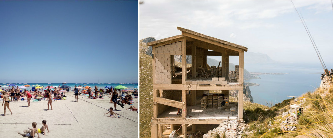 另一处展场在海滩另一端的加洛山(Monte Gallo)最高点Pizzo Sella,是因为黑手党违规开发而被扣押,最后废弃的地产项目。布鲁塞尔的艺术家组合Rotor将人群再次引导到这处废弃的工地,并在废墟中重新审视周围本来一直存在的美丽自然风光(Da quassù è tutta un’altra cosa [from up here, everything looks different], 2018)。不过,我们到了海滩以后,发现并没有任何公共交通可以到达,若步行则要在烈日中行走将近50分钟——还是在不迷路的情况下——就临时决定最后这一天在海滩度过了。很多到访巴勒莫的策展人和媒体人也和我们做出了类似的选择,海滩上满是Manifesta 12的布袋子。
