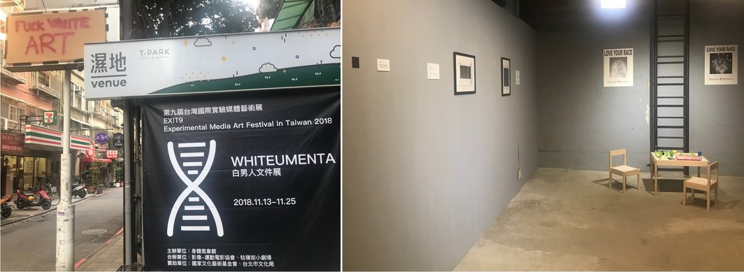 此行当中一段能够轻易成为趣闻的看展经历是拜访“白男人文件展”(Whiteumenta)。我们严格按照门口张贴的入场规则支付了门票(发达国家访客300台币,发展中国家访客100台币,媒体观展也也不例外,只有台湾护照持有者可免费进入),随后进入这个位于林森北路前红灯区的地下室空间。我们在展厅偶遇该展览的策划人洪子健,他导览时说:“有亚洲影展、女性影展,黑人影展,为什么不能有白男人影展?”台北白男人影展今年已经是第五年,而五年一个周期,首届“白男人文件展”应景而生。展览包含了一些艺术家的小型/小品式创作,以及一部分半虚构/推演性文献,共同讨论了种族政治、白人至上主义以及男子气概的话题,其中多件作品的黑色幽默让人捧腹。“白男人文件展”整体作为一个观念项目给人留下的印象要深过其中的单件作品,这不妨碍展览成为对高学术浓度展览审美疲劳的一剂解药,也为关于权力、殖民及沙文主义的讨论提供了一些全球语境。