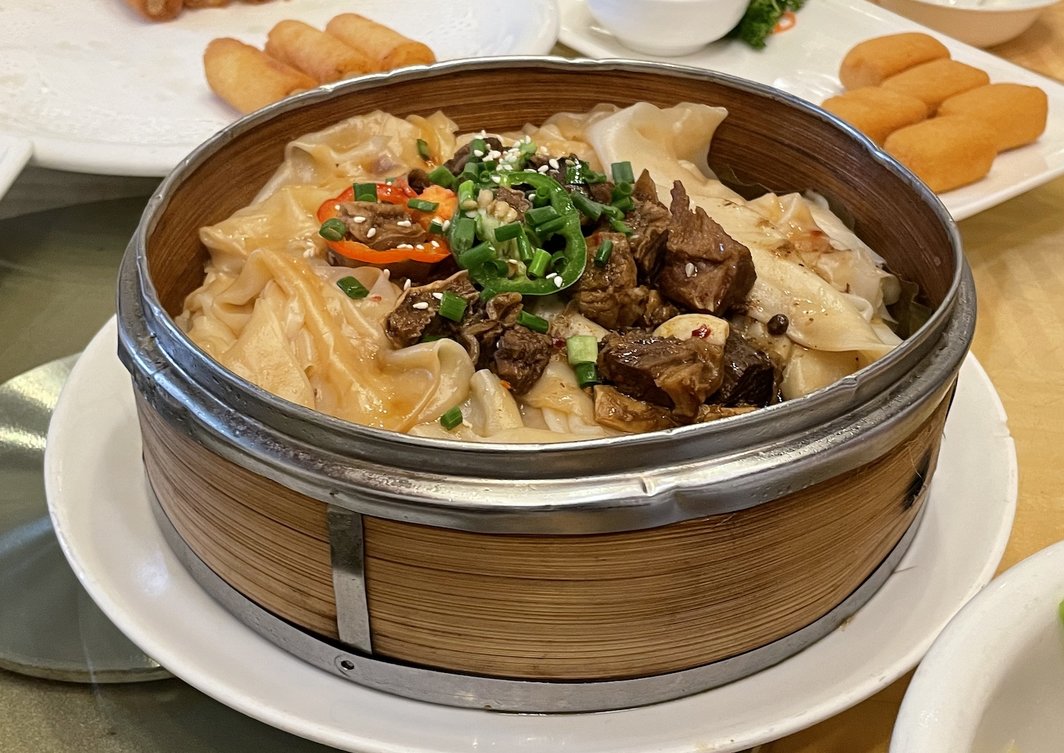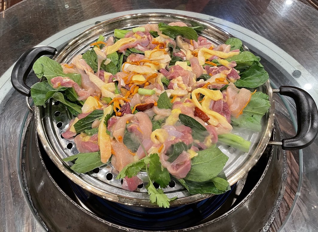 而顺德确实也以“私房菜”闻名,尽管几家在《寻味顺德》中出镜的私房菜现在已经人尽皆知,现在人们只能在定位和排队中继续体会这种求而不得。馆方在紧张的日程中为客人们安排了许多饕餮的计划,除了海鲜酒家这样的基本操作,还租了大巴拉大家去体验本地的大排档。但为了追寻地道的“定制”感,我趁着休息的时间搭了朋友的便车,根据本地朋友提供的名单,打卡顺德的招牌菜:炸牛奶、陈村粉、伦教糕、姜撞奶、双皮奶、桑拿鸡、桑拿鱼。不管走到那里,不管是大菜还是小菜,每一道菜的用料、火候和摆盘都十分讲究。尤其是桑拿鸡这道菜,均匀切制连皮带肉的土鸡肉平铺在虫草花点缀的应季的菜心上,光是摆盘就让人赞叹不已。熬制好的鸡汤高汤滚开传出阵阵草药的香气,大概几十秒鸡肉便蒸熟可以蘸调好的酱料食用。“Delicate!”——和我同行的朋友评价道,我想这是食物能得到的最好的评价之一。
