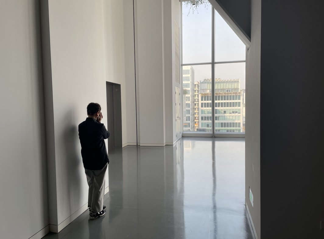 此类反差与矛盾令人陷入沉思,但有时也让人忍不住莞尔。六楼电梯门打开后,三位统一身着美术馆服务人员制服的表演者会雀跃、舞蹈着出现,并欢唱着“ohh......this is so contemporary”,他们无比热情的笑容能让每个经过者都略感羞涩。提诺·赛格尔(Tino Seghal)的作品《这太当代了》(This is so Contemporary , 2004)是禁止拍摄记录的,但作品总有暂时结束,或还未开启的间隙,所以我偷偷拍下了表演者还未成为作品前的背影和独自等待时的捂面——她揉搓着脸部和太阳穴,大概是因为全天的热情工作,笑僵了自己的苹果肌。