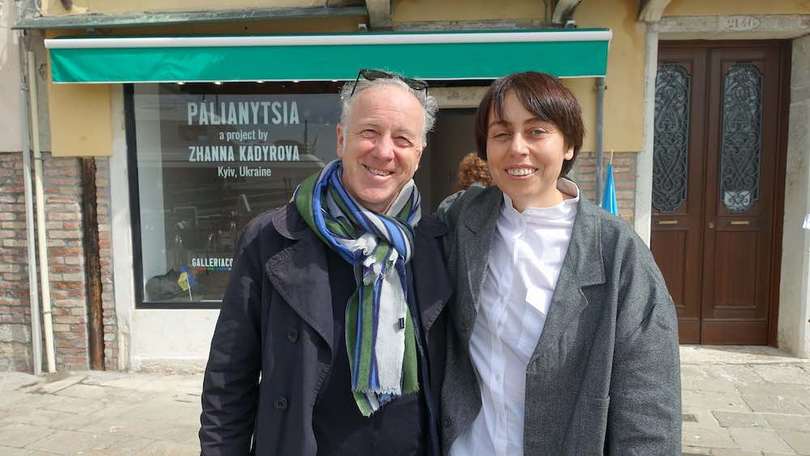 双年展的组织方承诺确保乌克兰得到充分地呈现。就在开幕前几天,他们以“乌克兰广场”(Piazza Ucraina)的形式表示了第三次致敬,这是贾尔迪尼花园的一片空地,烧焦的建筑残骸与沙袋堆成的小塔并置——这种沙袋是用来保护公共雕塑的。下了Ponte San Biasio delle Catene桥,常青画廊为他们的艺术家詹娜·卡德罗瓦(Zhanna Kadyrova)找到了一个店面,用来举办筹款活动。展览以一种名为“Palianytsia”的乌克兰面包命名,包括一些新的用河床石头雕刻成的面包状雕塑,这些石头都是艺术家在乡下避难时捡的。此外还有一部伊凡·苏特金(Ivan Sautkin)拍摄的纪录片,仍在制作中。 “我在这里感到内疚,能见到老朋友,能轻松入睡,”卡德罗瓦承认。“这就像突然从旧日的生活中醒来,但我必须记住这种生活将不再属于我。”卡丹在与《艺术论坛》杂志主编大卫·韦拉斯科(David Velasco)的简短对话中表达了类似的迷失感,这是杰罗姆·波吉(Jérôme Poggi)在Serra dei Gardini花园举办的早餐活动的一部分。在谈到俄罗斯馆的话题时——俄罗斯馆在艺术家基里尔·萨夫琴科夫( Kirill Savchenkov)和亚历山德拉·苏哈雷娃(Alexandra Sukhareva )以及策展人瑞牧德斯·马拉萨斯卡(Raimundas Malašauskas)都退出后保持关闭状态——卡丹表达了他对抵抗的支持,同时强调了进行抵制的必要性:“随着普京主义转变为纯粹的极权主义……俄罗斯知识分子们将面临成为‘真正’异见者的挑战。”