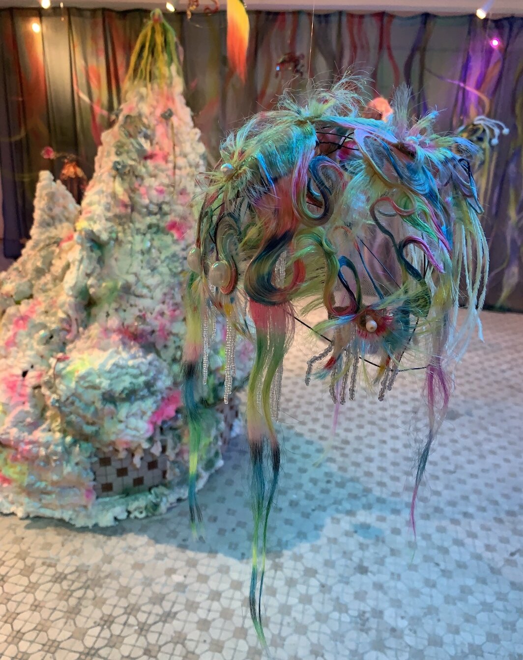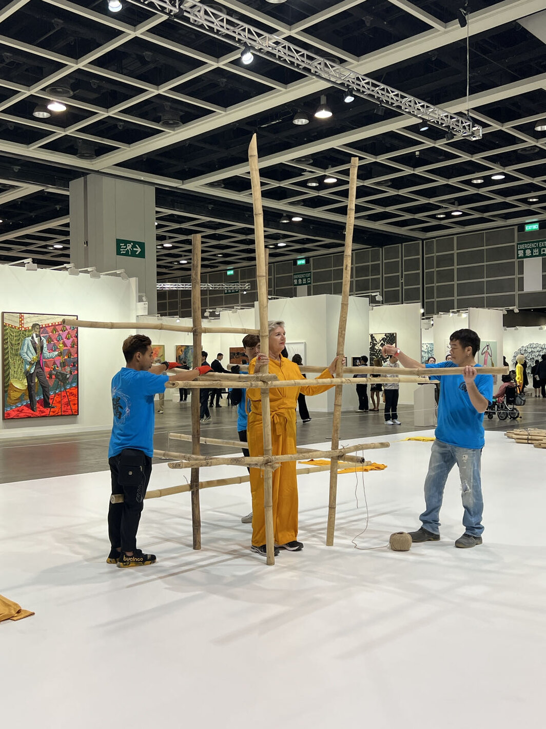 第二天的会展中心,香港再次用它的高效证明了这里依然是资本和机遇在亚洲流通的最佳中转站。我跟艺术家杨沛铿约在他这次参加巴塞尔博览会“艺聚空间”(Encounter)单元的作品《屋檐下的拥抱先生们》(2021)下碰面。被连根拔起、悬在半空的绿色植物似乎也可以用来隐喻艺术家本人的近况。他去年大部分时间都在欧洲和东南亚进行驻留,今年很多展览计划也可能都在欧洲。就这些不具备更大商业价值可能的作品而言,他们只能向外,我们主动或被动地选择了“内循环”。而香港和内地之间的艺术交流已经因物理和政治因素中断许久,想要迅速恢复到疫情前的水平暂时不太可能。走马观花地看完今年的展会,最直观的感受是“安全”。换句话说也就是,视觉上令人愉悦的绘画作品占据了多数。那么,那些挑战观者走出“舒适圈”的作品未来前景该如何呢,留给它们的舞台会不会越来越窄?也许这不是一个需要在博览会上思考的问题。毕竟,后来从一些画廊的朋友处得知,这次展会销售还算不错。尤其内地的一些中小型画廊,有回本和小赚。我为他们感到高兴,毕竟他们才是艺术商业系统里的大多数,而且是每个地方艺术基础设施和生态的重要贡献者。
