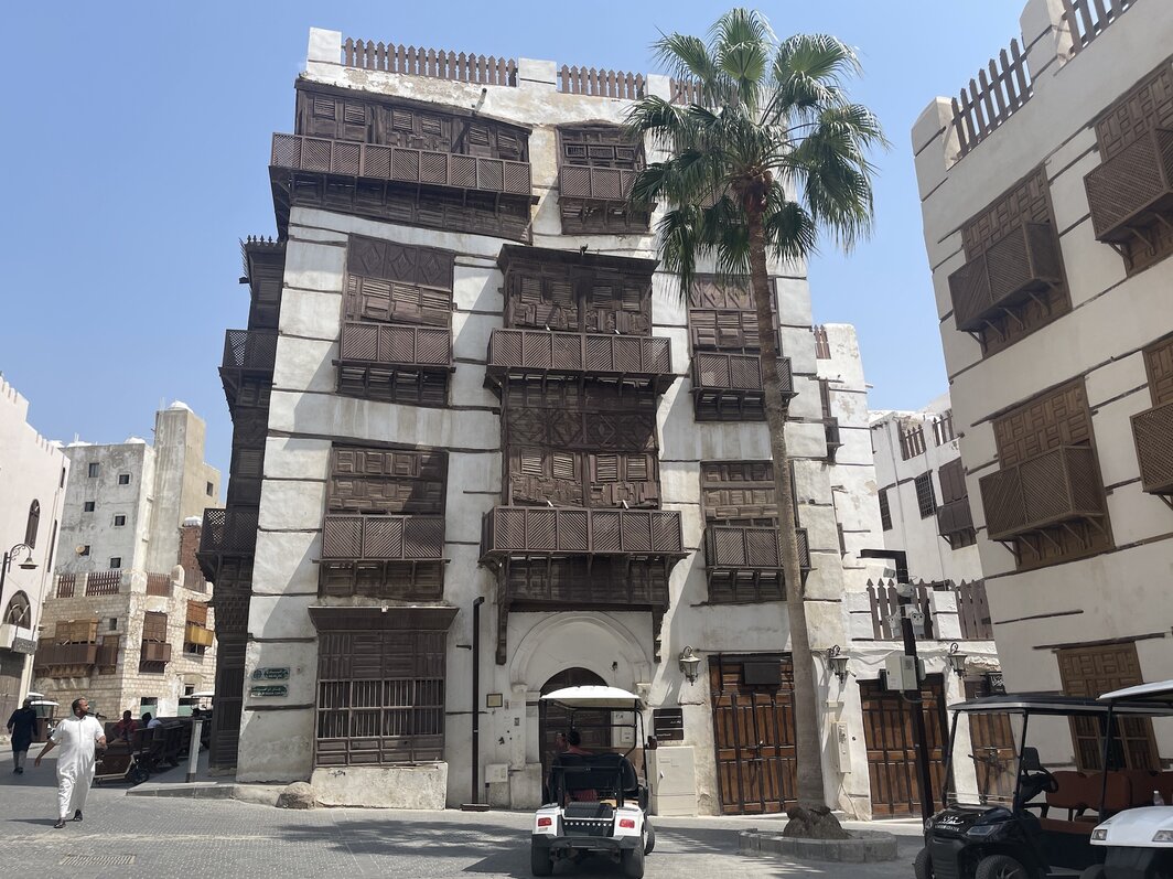 在吉达老城区巴拉德(Al-Balad),三位受雇于即将开放的游客中心的年轻女孩主动与我搭话,并热情地带我逛了一圈,为未来的导览工作操练。巴拉德是70年代沙特发现石油之前吉达的中心,坐落于城南和市区边缘。目前,一半的老建筑已经翻新加固,另一半破败甚至摇摇欲坠。可以想象在不久后,这个崭新的古城旅游区将泛滥于游客的打卡照中。