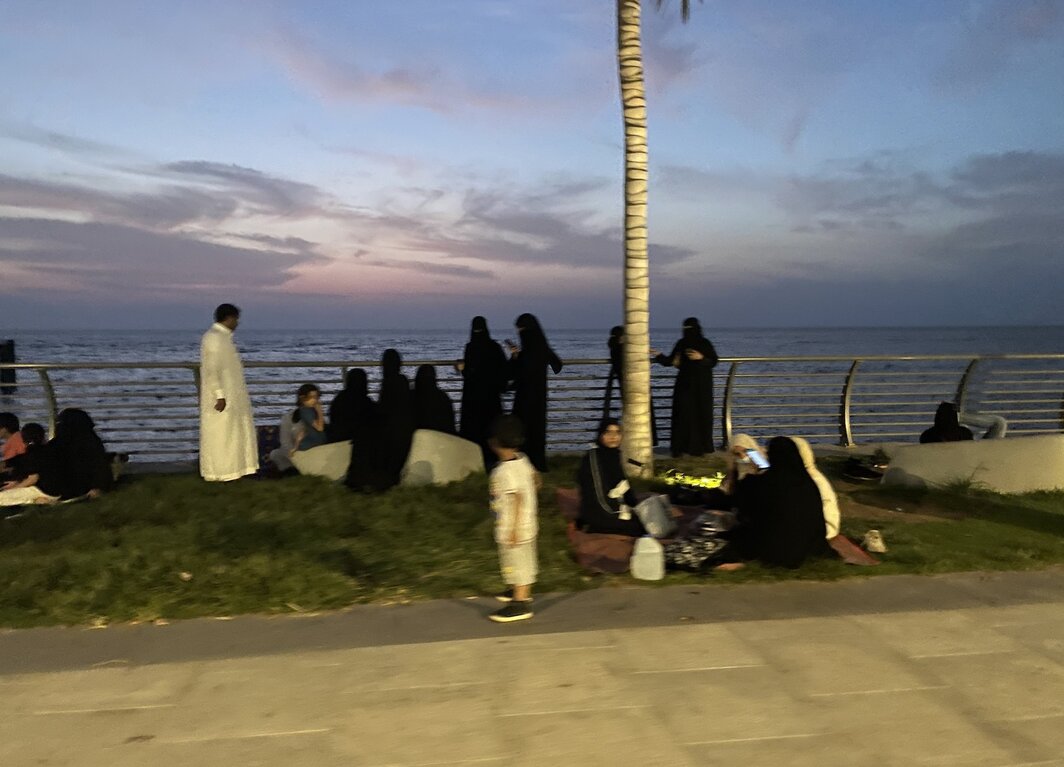 在全社会以举国之力奔向未来的发展潮流里,绝大部分沙特人在以自己的方式适应加速度。每天傍晚,红海岸边的绿化带坐满密密麻麻聚会和野餐的本地人,可以感觉出吉达本地人过着丰裕悠然的中产生活,商场、精致咖啡馆、高级餐厅随处可见。由于服饰的统一和隔绝,我很难看清/看见人们的表情和个性,他们让我感到神秘,反过来,我在街上行走自然也吸引了无数的凝视。