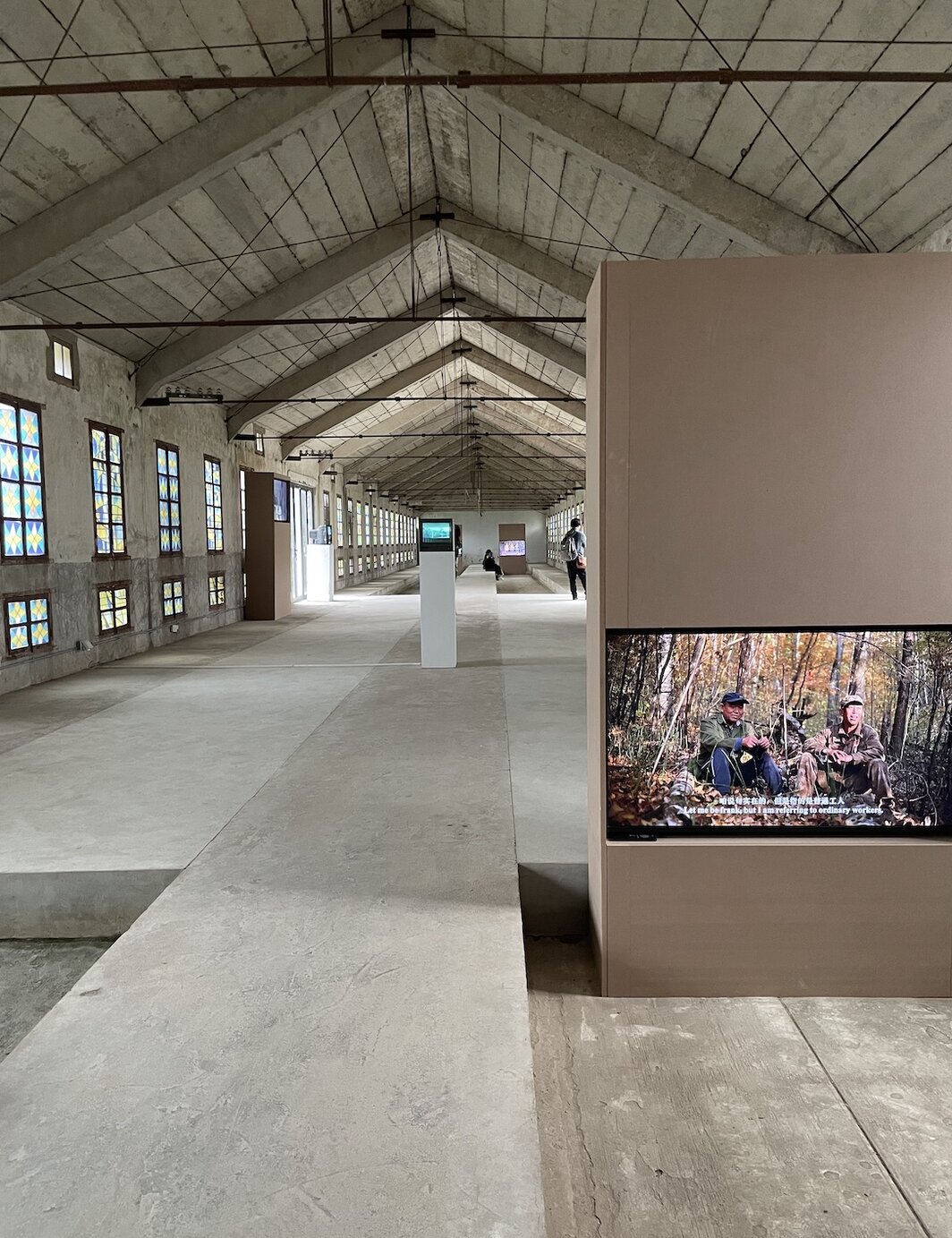 没顶美术馆的另一场展览——刘雨佳的“故事山脉”同样可被视为一例。展出影像的素材大部分源自艺术家2022-2023年间在长白山和松花江上游地区的四次旅行拍摄,但与之前她在北京当代唐人艺术中心的个展不同,这次几件主要作品都以人物叙述为主:採参的猎人,守庙的道姑,在本地颇有威望的萨满家族,自学成才的女巫医。镜头里,这些人要么正侃侃而谈自己的人生经历,要么正在进行某些神秘、吵闹的疗愈仪式。根据与我们一同上岛的展览策展人王洪喆的介绍,不同影像作品在空间中纵深的递进关系模拟了进山的过程:从门口进入细长的平房走到底,如同从山脚走到山顶,对应着从世俗世界迈入灵性世界。什么样的灵性呢?放在最深处的双频道录像《三江源头故事集》最明确地回答了这个问题。片子主角是一位身着朝鲜族服饰、说话带笑的中年妇女,也是一位自学成才的女巫医。我们一边听着左边屏幕上的她绘声绘色地讲述如何在长白山“修炼”期间获得了与动植物对话的能力,又如何在梦境指引下找到济州岛上已经等候她多年的老和尚并治好了他的重病,一边看着右边屏幕上的她跪在炕上给病人“发功”治疗,同时两眼不忘紧盯电视上的韩国综艺节目。“东北的民间信仰就是这样,没那么严谨,这里拼一点,那里凑一些,佛教、道教、气功、萨满、韩国综艺,能用的都用上,很自由。”王洪喆说。显然,在他的诠释下,这个集多物种、非人类中心、另类认识论等各种时下艺术界流行关键词/概念于一身的健壮、强韧的女性形象已成为某种始终处于流变当中的民间神秘力量的象征和载体,历史话语无法围困她,现代文明无法驯服她。而整个展览的布置,按王洪喆的说法,也如同一座山间寺庙,不同的人物、故事和声音在其中此起彼伏,互相干涉,彼此交融。这个像水陆道场一般热闹的展览空间或许捕获并传送了某种来自太古、颠扑不破的生命能量,但当逃脱现代化话语规训的民间宗教碎片被拼接成一段完整连贯的叙述时,启蒙“余毒未清”的我很难不怀疑这是一种浪漫主义的重来,就像听着女巫医戏剧化的故事,你很难不在某一刻感到过分熟悉。