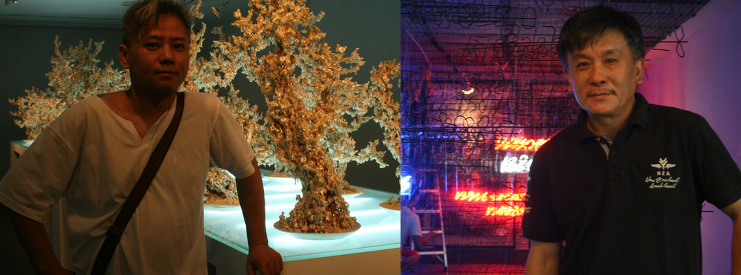 一楼两边的展厅平均放置着湖南和湖北的作品,一眼看过去形成两省对垒的姿态,但气氛并没有外界怀疑那样紧张,对于艺术家或者观众而言,回顾性的展览意味着总结,也意味着新的开端。在湖北的展厅中可以整体观察到湖北的多种绘画风格的传承和发展,例如以尚扬为代表的多变实验风格,以魏光庆、杨国辛等人为代表的波普风格,以冷军和石冲为代表的观念写实画风,都是八、九十年代的经典之作。湖南的装置作品偏多,再加上本次参展艺术家多达90多人,美术馆的空间明显不够用,蔡东4米多的作品《猫碑》和《竹碑》被塞到展厅一角,作品上端几乎顶到天花,旁边还挂着唐建文4米多长的作品《地毯》,削弱了作品原有的力量。杨劲松的作品《蜃市》是一个和观众的互动装置,他制作了300多个铁质电话号码,从天花密密麻麻地悬挂下,背景是霓虹灯和反复书写的号码,原计划观众可以穿梭在电话号码之间,然而由于空间太小,整个作品在入口就被封起来,变成一个橱窗装置。新历史小组对年轻的观众而言比较陌生,他们多年没有以集体的形式出现在中国南方,新历史小组作为此次展览特别项目中的一组展示了他们的历史文献,观众得以了解新历史小组在1992年“广州双年展”上的“大消毒”或者1993年“大消费”等行为始末。