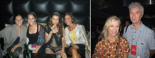 左:(左起)艺术家 Sara VanDerBeek、 Rupprecht Geiger文献库的Franziska Harder、艺术家Kerstin Brätsch, 和Lisson画廊的Patricia Pratas (图片提供: Tamsen Greene) ;右:艺术家Cindy Sherman与音乐家David Byrne