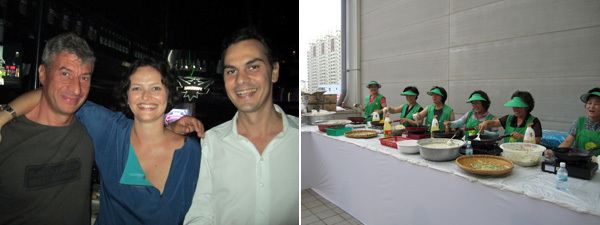 左:艺术家Maurizio Cattelan 和策展人Cecilia Alemani、Massimiliano Gioni;右:开幕现场在制作葱油饼