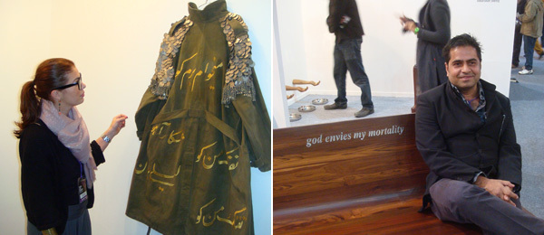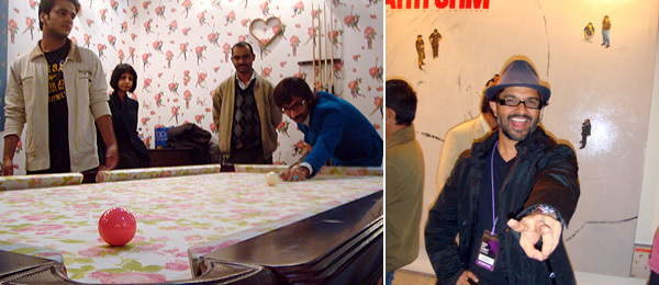 说道“造物主们”,有人八卦后殖民主义理论的创始人Bhabha在Ranbir Kaleka的作品前徘徊得尤为长久。这个作品是一个绘画加视频的三维艺术,也许Bhabha在思忖二者间的关系。不远处,Jiten Thukral和Sumir Tagra两位艺术家在“安全行事”(译注:原文为动词词组played safe。这里为双关用法,因为Playsafe是一个安全套品牌)。这对号称“双T”(T & T)的搞怪艺术家们支起一个台球案,上面只有两只球:粉色象征了性伴侣,白色象征了安全套。如果有谁能将任意一球打入球袋,便能获得一个小礼物:印着安全套图案的底裤。在其他地方,各种作品也被抢购一空,速度之快如同双T的台球。经销商Mortimer Chatterjee非常满意,他卖完了所有作品后说:“印度的艺术时代到来了。”