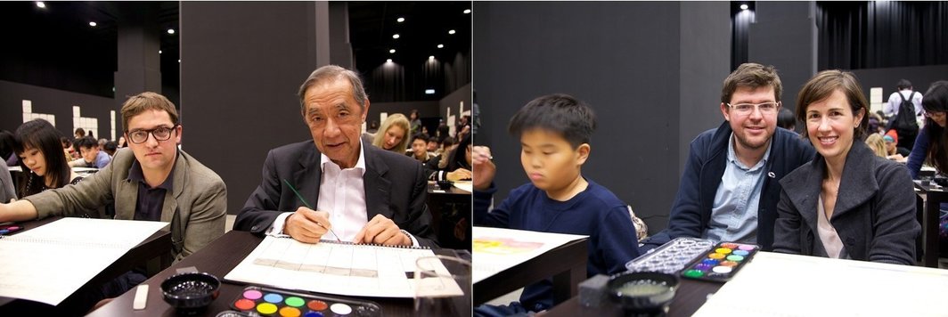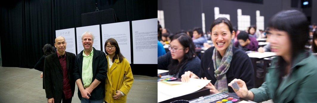 手绘月历原稿被整齐地排在一片望不到尽头的小桌上,画具早早备好。参与者们席地坐在小垫子上,一眼望去,规模之浩大,有点科举考场的味道。许多画廊家、收藏家和艺术家们都携妻带子相邻而坐。参观人群则沿着大厅游走,欣赏挂在四周墙壁上的日历复制版。一位外国策展人匆匆地从我身边走过,带着几份失落地嘀咕到:“可惜都是中文,看不懂。” 学者何庆基站立在一面墙前,有点泪光闪烁,指着一幅日历上自己的画像,说道:“这么多年了,没想到宋冬还记得我们第一次在香港的展览!”