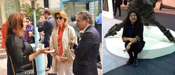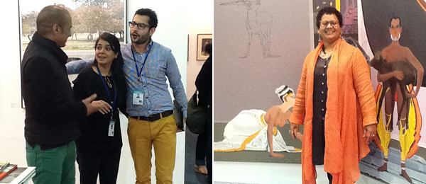 与那晚镜子碎片的光亮相互映照的是披金戴银的客人们。里面的艺术界名流有威廉•肯德里奇(William Kentridge), El Museo del Barrio的首席策展人恰斯•马提内兹(Chus Martínez), Beaux-Arts的编辑法布里斯•波斯图(Fabrice Bousteau), 古根海姆的桑德希尼•坡达(Sandhini Poddar)。同时出现的还有Lekha 和阿奴潘姆•宝达(Anupam Poddar), 他们是德里的Devi艺术基金的母子搭档。孟买的Dr. Bhau Daji Lad城市博物馆的名誉总监塔斯尼姆•梅塔(Tasneem Mehta), 以及一些本地创作者。米苏•森(Mithu Sen)在她的肖像前高兴地摆出姿势,头发上插着一朵花。T.V. Santhosh在他的雕塑Effigies of Turbulent Yesterdays边上休息。在德里艺术画廊的展台处,巴蒂•科尔(Bharti Kher)夸赞着加尔各答的绘画, 而被誉为“孟买男孩”的波斯•克力什纳马查理(Bose Krishnamachari)对此表示了同样的赞许。
