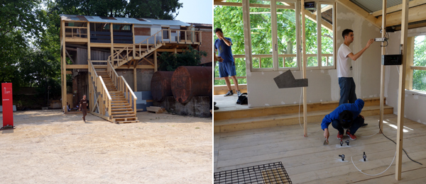 在绿园城堡,建筑本身似乎成为了这一天的主题,萨拉•兹(Sarah Sze)以她在没过关的的伸展装置《三态点》(Triple Point)打破了室内和户外的疆界,西姆林•吉尔(Simryn Gill)将屋顶都从澳大利亚的寓所挪了下来。格鲁吉亚馆,一个树屋被加在了一座老建筑上,但是艺术家谢尔盖•特里普宁(Sergei Tcherepnin) 和格拉•帕塔舒里(Gela Patashuri)解释道,这种寄生式的建筑在第比利斯很普遍。在以色列馆,地板上的一个巨大的洞意味着吉拉德•拉特曼(Gilad Ratman)的《工作坊》(The Workshop)里的洞穴观察者所使用的“隧道”,他们留下了粘土画像,成为路过此地的证据。韩国策展人 Seungduk Seo想让艺术家的创作能够充分呈现国家馆。Kimsooja的《去呼吸》以反射的嵌板盖住了墙面和地板,吸引了人们对建筑本身的关注。观众脱了鞋按顺序进进入一个被剥夺了感觉的密室中。