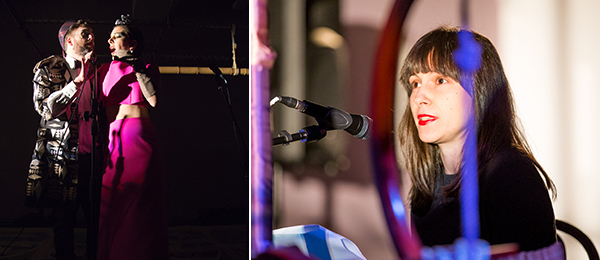 这一假设也在早些时候马修·迪克曼(Mattew Dickman)的表演中得到了验证。马修独自站在台上朗诵诗歌,这看似保守,实则是当晚最具迷惑性、最为新颖的表演:他将极度私密的语句——“你的脚踝令我想要狂欢,想要坐下同时祈求同时翻滚在藏有你的脚踝的那双马靴下”——同历史和流行文化通识并置(“葛底斯堡的演讲是所有演说中最精彩的…”)。观众给予了马修当晚最为喧闹的反应,这也表明了真正的创造性蔑视普遍观念中中产阶级的雅趣并将我们引向全新的境地。为保持匀恒,演出最终以回归到戏剧性的“卡巴莱”作为收尾——温迪·贝文(Wendy Bevan)庄重地演绎了她的“女歌手”角色。身着闪亮长裙的温迪站在聚光灯下,歌剧式的渐强音将观者拉离出之前表演所营造出的“实验性”氛围,这一片段提示着我们——“卡巴莱”毕竟如其定义,是一种娱乐。