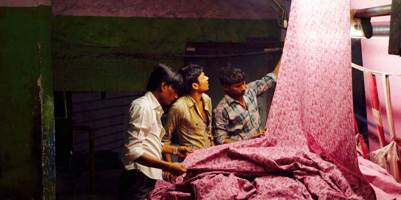 虽然故事以残酷的失败告终,但《工厂》在一场将劳工和公民社会团结在一起的斗争中找到了一丝希望。而《机器》提供的则是一幅全然黯淡的图景。这部70分钟的纪录片发生在古吉拉特邦萨钦的一家血汗工厂,那里没有任何安全标准或操作规定。贾因像侦探审视犯罪现场一样,在极度肮脏、灯光昏暗的空间内巡视,偶尔会停下来进行紧张的采访。摄影机大部分时候都在移动,仿佛无法忍受在任何一幅图景停留太久,不过它总是时不时地晃到一个画面——一个青少年灵活地折叠着那些从织布机中源源不断吐出的带有图案的织物——似乎被它无法解释的美丽所震撼。