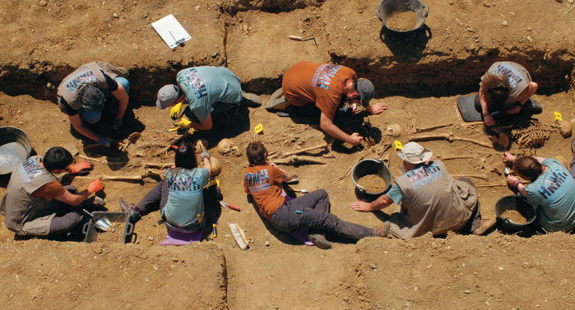 如果说《平行母亲》把阿莫多瓦对男性的驱逐发展到了一个新的极端,那么它也同样体现了一种复杂而曲折的想要把他们从流放状态召回的欲望。在电影的开头,雅尼斯在拍摄阿图罗时原本想用一个头骨作为道具,但后来觉得这种《哈姆雷特》式暗示意图太过明显了。无论明显与否,这对于一个结束在所有人望向一个布满男性遗骨的坑穴的电影来说都是有用的。电影仿佛唤醒了克劳狄乌斯(Claudius)的旨意:“此墓地应有一座活的纪念碑”,拍摄这些遗骨的倒数第二个镜头被另一个镜头取代:阿图罗领导的人类学团队躺在他们的宿舍里,他本人处在正中间的位置。