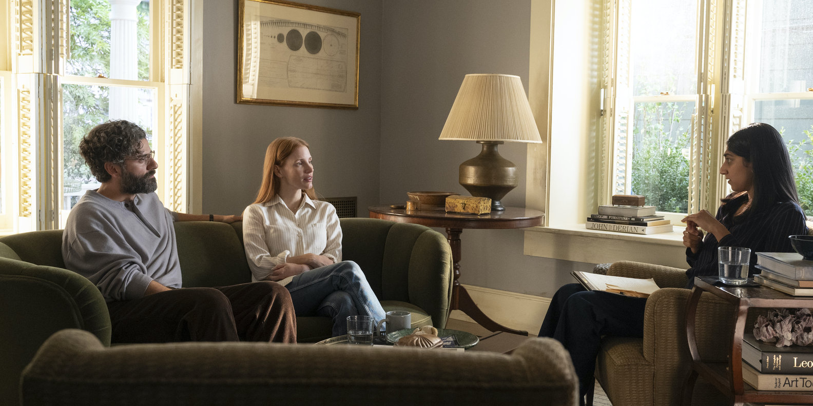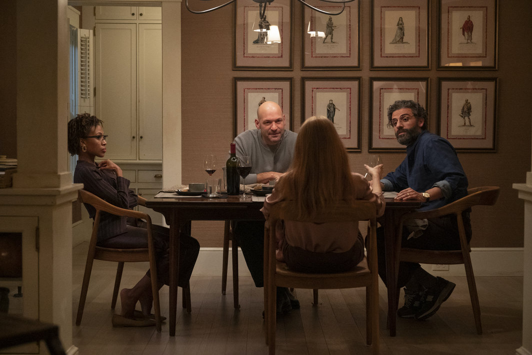 原作的剧情并不复杂:来自中产家庭的玛丽安与约翰婚姻生活看似平常,直到有一天丈夫毫无征兆地宣布自己爱上了另一个女人,并不顾劝阻夺门而出。原有的家庭结构平衡被打翻,两人都不得不重新审视自己的情感与寄托;在这一边,约翰如愿以偿地与新女友飞赴巴黎,出走的激情却被渐生的倦怠取代,而另一边,玛丽安在经历了被分手的不甘与窘迫后,反而释然地与孤独宿命达成某种和解。经历了空前激烈的争吵咒骂与重续温情的短暂交好后,两人最终在错位与失落中渐行渐远。HBO版本的剧情在很大程度上忠于原版,每处情节的起承转合几乎都遵循了原作,只是约翰成了乔纳森(奥斯卡·伊萨克/Oscar Isaac饰),是麻省塔夫茨大学的哲学教授,而玛丽安则成了米拉(杰西卡·查斯坦/Jessica Chastain饰),是跨国通讯公司的产品管理副总裁——这次,女方成了主动出走的一方,对象是工作中认识的创业公司年轻高管。与其将列维的这一角色策略表述为“性别互换”(gender flip),不如视其为对于第二波女权主义兴起以来,女性大规模走出家庭并加入劳动力市场,打破男性以单份工资养家模式的更广义上的指涉。