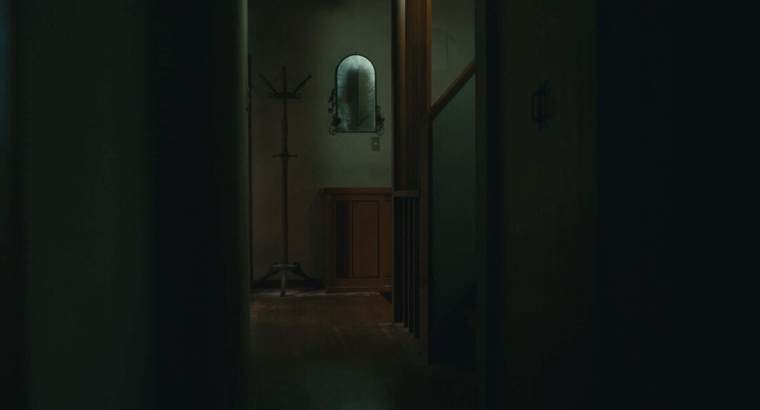 《午夜凶铃》和《咒怨》之间关于“内/外”边界的结构性差异,还体现在影片中对于“凝视”的表现手法上。毫无疑问,通过表现主人公长时间凝视某个地方——往往是镜子或某个角落——并引起受众的恐惧心理,从来都是恐怖电影的常用技巧之一。在《午夜凶铃》中,“凝视”的场景突出呈现在影片最后高山龙司与贞子的对峙中,而在《咒怨》中,人物对于某个地方的凝视则得到了大量运用。通过“凝视”,原本的日常开始发生变化,本来不应该出现的怪异现象变得可见。不过,在《午夜凶铃》里“凝视”呈现的同样是“内部”与“外部”的关系,或“外部”对“内部”的突然闯入:贞子的现身可以被理解为一种精巧化了的“突发式惊吓(jump scare)”。与之相对,《咒怨》中的“凝视”则呈现了“内部”本身的变化或不安:恐怖的东西并不是突然闯入的他者,而是早已存在于原本的生活之中了。在Netflix制作的剧集《咒怨:诅咒之家》(2020)中,“凝视”的上述呈现方式更是被推到极致:受众被要求直接长时间地凝视一面镜子,而镜中始终没有出现任何怪异的东西。也就是说,令人感到不安的,不再是以幽灵为代表的“外部”,而恰恰是日常生活的“内部”本身。这里透露的信息是:对于社会的均质而普遍的行政管理,已使得人们与自身的生活产生距离,以至于“物”本身开始变得陌生、怪异、偶然、不稳定。