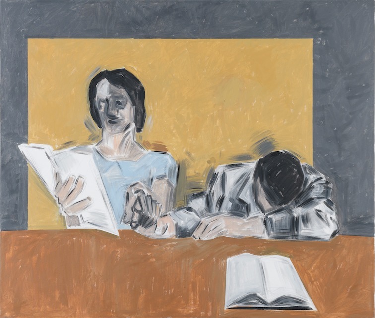 我作品中的人物形象一般都是复数的,因为:如果你是这世界上唯一仅存的人类,你甚至不能跟谁分享你看见了一棵挺拔雄伟的树这件事。所以我喜欢绘制两三人的场景。对我来说,绘画中的形象就像国际象棋棋子,我一般每几年会往里面添加一枚棋子,或者说新的主题形象元素,类似创造属于我自己的字母表。我第一个描绘的物件是鞋,因为在过去我尝试制作大而愚笨的画面——虽然这些画面的尺寸比起我在中国看到的那些不算什么——以此营造一种反差效果,所以我往往在大画面中呈现小小的鞋子。鞋子的小尺寸是我选择专注于描绘它的原因之一;其次,在出生的时候,我的一只脚有残疾。小时候,我也曾在深夜尿在鞋子里,因为厕所太远了。我的母亲不给我买运动鞋,因此体育课的时候我就要穿着普通的鞋子。没过几天鞋子就漏了,我只好拿些纸张来补上。我因鞋子吃了不少苦头,这是第一个为我带来强烈情感的物件。在形式上,鞋子也是奇异的。鞋子脱下来还是鞋子,而一件外套只会变成一堆褶皱。这些都是很琐碎的细节,但为什么不能在艺术实践中保留这些简单、琐碎但有趣的细节呢?绘画应当在这个意义上与生命及死亡相联。