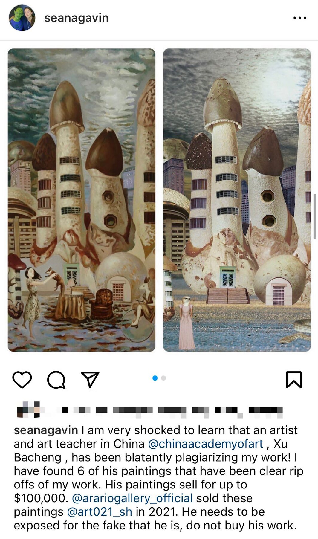 西纳·盖文4月20日的Instagram帖文,左侧为徐跋骋的绘画作品,右侧为西纳·盖文作品《蘑菇城市》(Mushroom City, 2012).