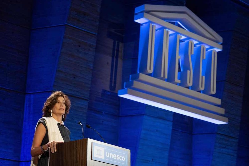 联合国教科文组织总干事奥德蕾·阿祖莱(Audrey Azoulay)宣布美国重返该组织. 图片: Alain Jocard/AFP via Getty Images.
