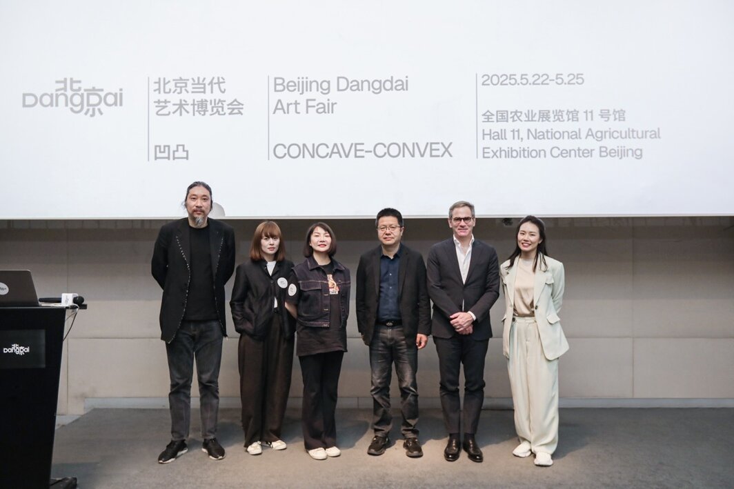 北京当代艺博会2025新闻发布会现场嘉宾合影,左起:北京当代艺博会艺术总监鲍栋、空白空间总监及合伙人张迪、北京七九八文化科技有限公司总经理严明丹、北京国际设计周有限公司董事长王昱东、UCCA尤伦斯当代艺术中心馆长田霏宇、北京当代艺博会拓展&贵宾总监魏冰婵. 图片:北京当代·艺术博览会.