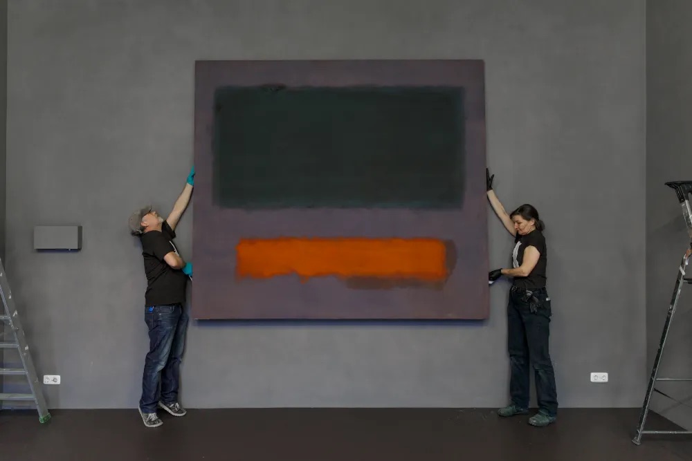 艺术品装卸员在阿姆斯特丹市立美术馆安装马克·罗斯科的《褐红色上的灰色与橙色,第8号》. 图片:Aad Hoogendoorn/Museum Boijmans Van Beuningen.
