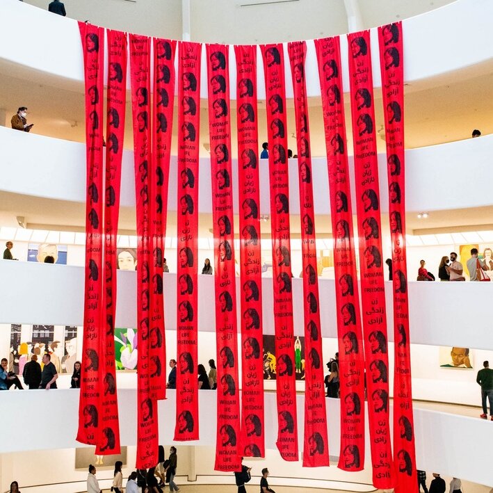 10月22日,位于纽约的“支援伊朗的匿名艺术家”(Anonymous Artists for Iran)团体在纽约所罗门·R·古根海姆博物馆进行示威行动,抗议今年秋天伊朗“道德警察”杀害玛莎·阿米尼(Mahsa Amini)事件。该行动团体的成员在古根海姆博物馆标志性的旋转楼梯的顶端展开十几条鲜红的横幅,上面印有22岁的阿米尼的肖像和“女性、生命、自由”的口号。与此同时,世界各地正在进行支持伊朗女性权利的抗议活动。