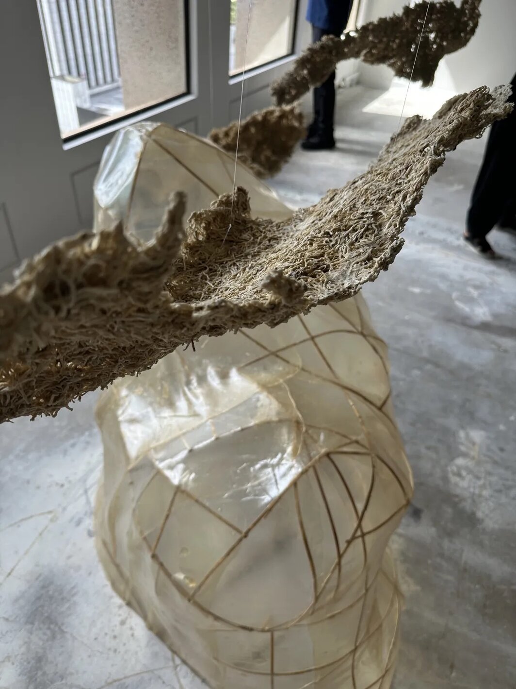 媒体预展从主办方称为“HT25 HUB”的空间开始 。这个位于戴维斯太平洋中心(一座看似普通的都市高层写字楼)十四层和二层的毛坯办公空间,是本届展览中规模最大的展场。韩国艺术团体“大米发酵姐妹俱乐部”(Rice Brewing Sisters Club)与夏威夷原住民(Kānaka ʻŌiwi)教育者伊凯卡·毕晓普(Ikaika Bishop)合作的雕塑装置引导观众进入空间,也为理解本届三年展关于“他者性”(otherness)与“入侵性”(invasiveness)命题提供了一个辅助视角。艺术家们将琼脂和入侵物种猩猩藻(gorilla ogo)转化为山峦流云般的半抽象雕塑。谈及这种肆虐夏威夷海域、挤压本土藻类生存空间的外来物种时,毕晓普提出了一种赋予其能动性和泛灵性的观点,认为猩猩藻“存在即合理”,应将其纳入对岛屿整体生态的理解中。这种对自然界入侵倾向的宽容态度,恰与去年备受争议的威尼斯双年展主题形成呼应——所有人本质上都是外人,而对某种理想化、亘古不变的伊甸园的想象,终究只是神话而已。