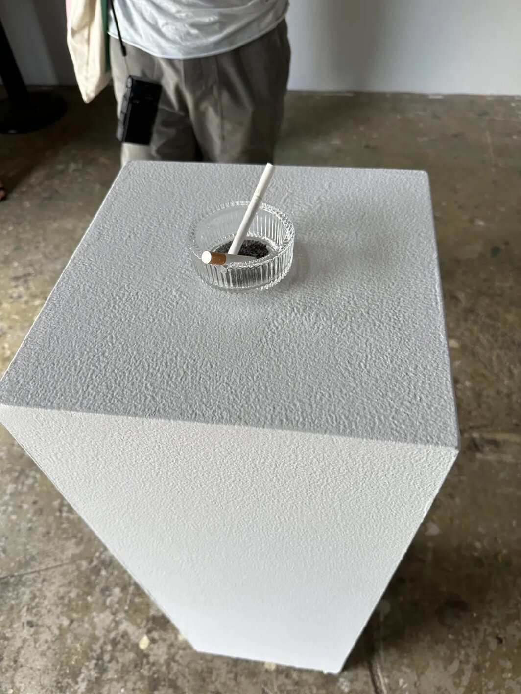 离开主展场后,我们来到Aupuni Space,这是岛上为数不多的替代性当代艺术空间之一。这里向观众展示了另一种应对入侵的方式:与之相爱。Futoshi Miyagi的小型装置作品与其“美国男友”(American Boyfriend)系列作品相关,包含两段影像、一张照片、一张海报和一件雕塑,记录了影片主人公与驻冲绳美军士兵之间的一段纠结复杂的长期暧昧关系。影像中将关于酷儿关系本质与身份认同的配音旁白与冲绳梦幻慵懒的风景影像并置。展厅中央的烟灰缸里,两支香烟相对而置,分别印有“希望”与“和平”的品牌名。这不仅唤起恋人之间稀薄纯粹的情感氛围,更象征性地调和了这段关系中特定的权力失衡。