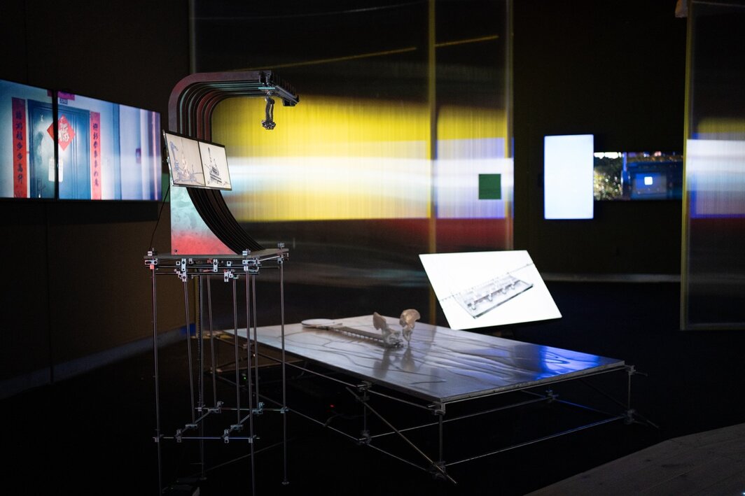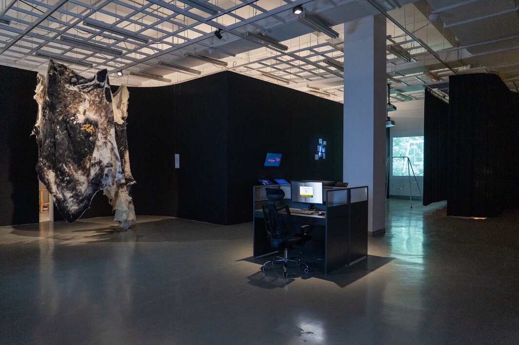 尽管灯光条件实在不佳,但为了解更多的作品信息,我还是尝试尽力阅读感兴趣的作品的文字展签。我能感到这些阐述里经常出现的某种表面化的“学术”风格:它们擅长援引后现代理论,并喜欢将一些模糊而高亢的语汇进行组合。这些雄心勃勃的表述或许源于学生在课堂中所受到的既定训练,这也如同一层人工锐化的滤镜,让这些作品本身的一些美妙的不确定性消失。另外,毕业生们的自我表述与策展前言也有着微妙的重合。本次跨媒体学院展览的主题叫做“众妙之门”(The Doorway to All Essences),延续了近年来该学院反复强调的线索与修辞:中与西、旧与新、复古与未来。在拥抱技术、召唤传统的双重动作中,或许也有着某些未竟的议题吧。