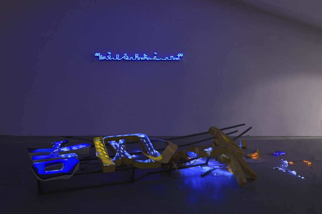 何岸,《我讨厌拥有和被拥有》,2014,32x250x10cm,LED灯箱;《吉冈美穗》,2011,霓虹灯箱,尺寸可变。