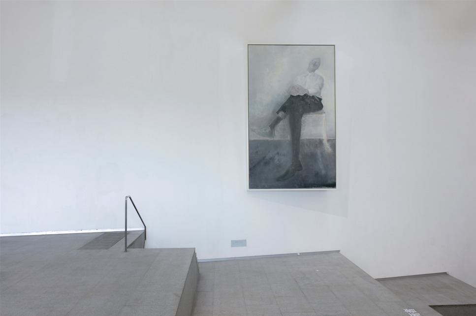 在毛焰的实践中,人物肖像总是现身于某种被净化的精神世界——没有世俗场景、不带神话或者宗教寓意、没有情节甚至难以从画面中发现任何“有效”信息。他从90年代中期开始就不断地画一个叫托马斯的欧洲人。画面中的“托马斯”有时候像这位“戴帽青年”一样凝视着某个角落,但更多时候,他闭着眼睛,以头像或半身像的方式出现在一片混沌的背景中,他的位置也被毛焰反复调整,仿佛对艺术家来说,描绘对象并不是重点,怎么画和如何寻找一个肖像的本体才是核心所在。如果说伦勃朗通过厚实的笔触和戏剧化的舞台光线不断塑造了他所在的荷兰中产阶级群像,那么毛焰则是想通过反复描绘一个外国人来消解人物原有的社会符号。观众不知道托马斯来自哪里,他和中国有什么关系,甚至二十年过去了,他依然年轻地活在毛焰的画里,像一个古老的灵魂。在通向负一层展厅的侧墙上挂着一张巨幅的托马斯像(《椅子上的托马斯》,2009),被模糊的主体逐步向背景淡化,当观众匆忙路过这张画时,有一刻似乎与灰色的画面在空间中产生和谐的共振。