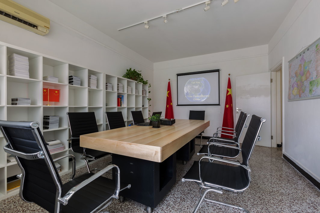 就创作手法而言,“应有掌声”可以说延续了艺术家2015年的个人项目“朝阳群众”:同样是在居民楼内,同样以假乱真的空间改造,题材选择上也都具有相当的社会敏感度。在“朝阳群众”中,艺术家“顺势而为”地将展览所在地A307空间改造为了一个典型的北京家庭陈设,需要仔细观察才会发现其中异样;而“应有掌声”则用充分的细节制造出了一个更真切、实在的环境,但行走其间,却能突然意识到整体架设中跃出的强烈非和谐音——将中国官方的驻外机构强行架设在针对外国外交人员的生活区内,这点似乎指涉了当下中国进入世界时的气势甚至蛮横;展览题目“应有掌声”也显得意味深长:是对此气势的褒赏?亦或对其行为之粗暴的嘲讽?如果说空间布置还处在立场相对中立或者暧昧的状态,那么展览中唯一一件图像作品则更加直白地透露出对中国当下外交心态的讽刺甚至批判。这张图像由投影仪打在白墙上,两边立起两面中国国旗。照片引用自真实的官方图像记录——中国驻爱丁堡总领馆的前副领事对当地政府官员做有关中国国情演讲时所使用的演示文稿的封面用图,上面写着“Tell You a True Contemporary China”(告诉你一个真正的当代中国)。这句充满教育者口吻的话中不乏当下中国“大国崛起”叙事中常见的自信与傲慢;而这种心态也正被国人内化为一种自我肯定的正面认知。不过,在近期国际关系动荡的背景下,艺术家在外交公寓塑造的官方外办无疑成为了一种提醒:中国确实以大国姿态登上了国际外交舞台,但这个过程并不如预期般顺遂,作为这个国家的国民,又应该作何反应?
