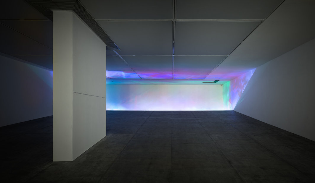 沿着一个微陡的斜坡,经过画廊空间拆不掉的承重柱,观众被坡顶隐现的典型“网红霓虹光”吸引着前行。走到尽头,便会遇到一道突如其来的“断崖”,往下看是角度别扭的镜子,倒映着暗藏于坡体内部的五颜六色的假山水。镜子被安排在与人们自拍习惯完全相反的位置,由于要反复寻找“作品”在哪里,整个空间到处是来来回回“复行数十步”甚至上百步的观众。尴尬的步行导致了执念,在不得不止步于“悬崖”后,人们只得反复如困兽般盘桓在唯一看上去有所表述的两句里尔克的诗句旁边。而展厅中并没有为“诗句”安排灯光,疑惑和迷茫似乎在努力看清诗句和无法对焦的手机之间被缓慢具象化而与斜坡对撞,那一度总被人挂在嘴边的“西西弗斯”此刻呈透明幽灵状凝固于空间中。