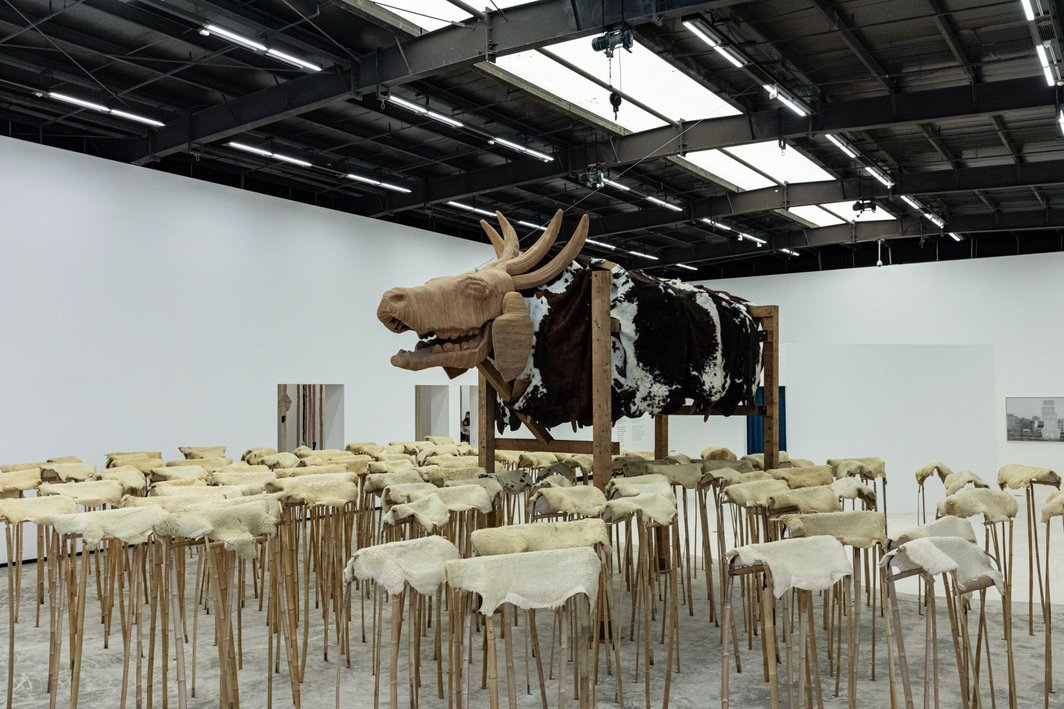 黄永砅,《羊祸》,1997,牛皮、羊皮、竹、木、铁,尺寸可变. 红砖美术馆展览现场.