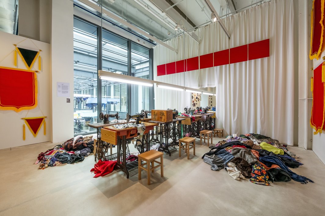 尹秀珍在展览对谈中谈到,由于母亲在国棉厂工作的关系,她自小便与纺织结下了不解之缘,对于纺织厂的环境也感到相当亲切熟悉。此次展览的空间布局经过精心设计,第一次把当代艺术展与香港纺织工业历史的常设展的内容有机结合起来。在新作《车间》(2020)中,尹秀珍首先“干预”常设展的内容,在墙壁上悬挂多幅通常用来表彰先进单位的无字红色锦旗,创造出一个类似内地纺织单位的场景;其后在紧临的展厅中用16台旧式缝纫机和满地衣物再造了一个真实的纺织厂车间。部分缝纫机和衣物专程北京运来,包括一台尹秀珍和母亲曾经共用过的带有艺术家小时候涂鸦印记的缝纫机,其余则在香港本地收集。