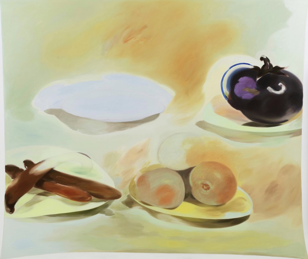在朱荧荧近期的绘画个展“兔子洞”中,观众踏入展厅首先注意到的,想必是那些被成倍甚至几十倍放大的现实之物的图像:蔬菜,一只盘子,一个碗,一双姿势别扭的持碗的手……这些尺寸扩大的日常物品似乎在提示观众,接下来他们要遭遇的,将不再是他们习以为常的那个现实。