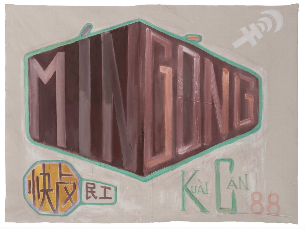 廖国核在他五一劳动节前夕开幕的个展“民工威武”上,以更明确的姿态展示了他一贯的古怪坚持和诚实:在字面意义上,他所画的就是他所宣称的,不会多也不会少。比如在《无题(双梯形 快餐 ⺠工 88 干))))》(2020)中,观众能发现的全部(可能)具有意义的内容,就是由绿线勾勒出的两个拼在一起的棕色梯形,分别写在梯形表面和下方两侧的“民工”和“快餐”(均以汉字和拼音字母表示),画面右下角的数字88,画面右上方斜立着的“干”字以及它头上三个逐渐扩大的、如同wifi信号标志一样的半括号。而在展览同名作品中,两个如纹章般醒目和风格化的图形将“民工”和“威武”两个词的汉字和拼音分别括于其中。