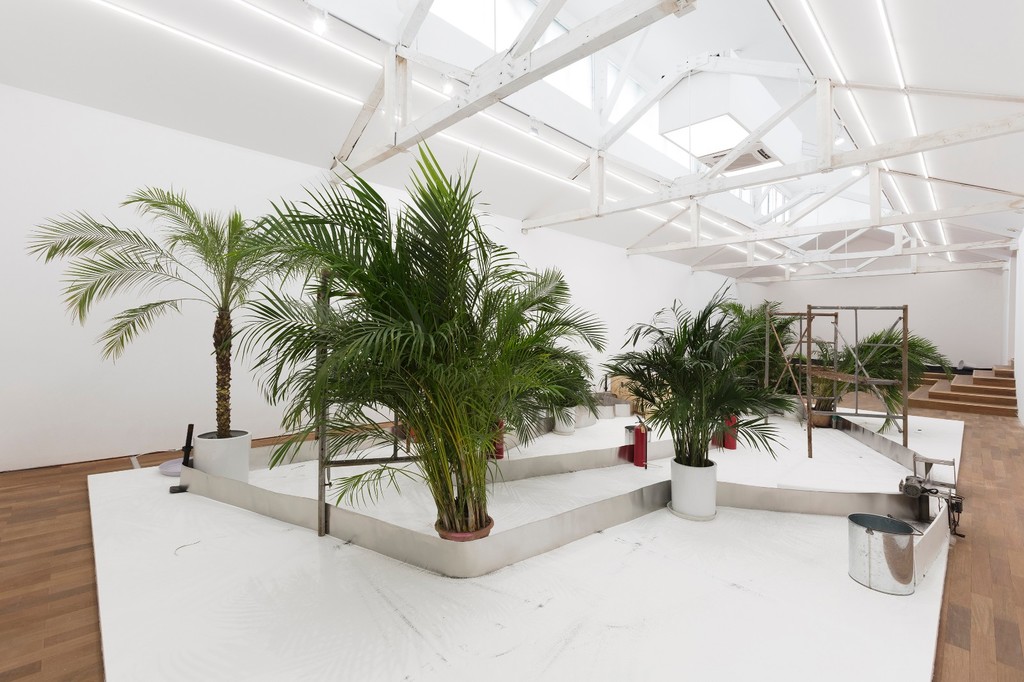 与蒋竹韵以往创作中广泛使用数字化技术不同,本次展览里唯一依赖程序的是《左右每秒》的“马蹄声发声器”,取自机动车转向声的模拟继电器在每秒开关闭合的声音。身处于逐秒计数的声音环境中,时间缓缓流逝,也几近停滞。能够将人从中唤醒的是《路径》中的50米不锈钢卷以顺时针方向行进摩擦产生的“噪音”——不锈钢卷穿梭于类似障碍物但同时也规划了其路径的灭火器、绿色植物、木箱等杂物之间,有时因故障而停顿,蒋竹韵需要不断通过身体介入让它重新启动。他将自己每一次在现场的调整视为一场即兴表演,有趣的是,当艺术家本人离场,在被界定的范围内,《路径》终将走向“内卷”。
