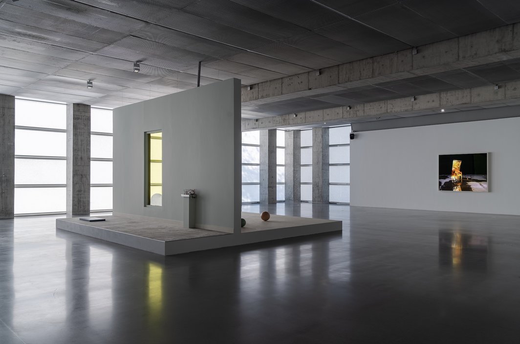 展厅中央组合在一起的两件装置作品《布洛克球》和《协奏曲/弹幕》不啻整个展览的核心意象。灰色墙上有一扇鹅黄色半透明门,将整个“中岛”分割成两部分:十八个大小不一的“布洛克球”——考虑到“block”亦有“方块”之意,“布洛克球”带着荒诞的矛盾修辞感——像新冠病毒的某种视觉隐喻,将孤独的人堵在墙的另一边。而孤独的人依旧在另一边的屏幕里,背对画面斜倚在沙发上,屋内落地灯因电压不稳而时明时暗,一切显得既安静又动荡不安,唯一的慰藉是观众发送的弹幕,会触发展厅中的合成器奏出一个随机音符。又或许,这弹幕不是慰藉,而是暗夜中的火柴,是展厅里唯一的声响奏出放大的孤独。
