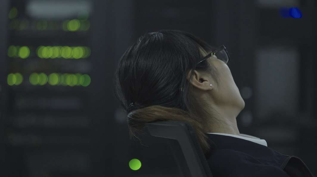 一个封闭空间,日光灯管投下均匀的人工光线,各处分布着监视屏幕,还有操作台、主机、通风设备、管道、成排的档案架……以及,一名女性。时间流逝,这个场景几乎没有变化, 除了屏幕偶尔闪烁,提示音响过,机器吐出故障报告清单,空调的风吹动一盆绿植,女性有时活动肢体。以上,是姚清妹在2021年完成的多章节影像作品“地洞”中最核心的场景:一个海滨度假社区的中控室。2019年,姚清妹在这个社区的艺术中心驻留期间,结识了中控室的工作人员,也就是片中这位女性,由此了解到她的日常工作以及其中无法被合理性或现实效用消解的荒诞成分。