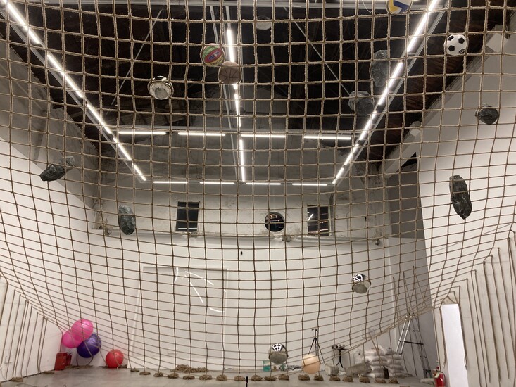 进入展厅的第一空间被一张自上而下铺陈开来的“二维巨网”笼罩,网是艺术家手工编制而成,网格在编织的过程中逐渐增大。各类球体从网的最高点滚落,依据自身大小和质量的不同,停留并嵌落到相应的网格中,其不同的下坠高度将“二维”的平面网络拉伸成三维结构。与此同时,分别由水泥、石膏、自发面粉调和制成的“流体”顺着网绳向下流淌,滴洒于地。这是刘月为作品加入的“时间之轴”,“流体”因材料属性在时间的进程中不断发生变化,其滴落地面的印记再回归到二维平面,形成一个完整的循环。可以想象,如果“流体”一直不停地滴落,最后又会再次堆叠为三维形体。在这里,时间是混沌的,不同的时间节点相互融解和渗透,“不断流逝的现在和不断被保存的过去”一同发酵和膨胀,吞噬着未来。而三个月的中断形成了时间观测与记录的空洞,于是我们在现场看到的物质印记如沉积岩般,具有清晰的层理构造,真正成为了某种意味上的化石。
